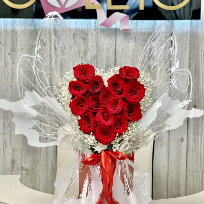 Heart shaped red roses arranged in large size box with a beautiful unique butterfly wrapped design